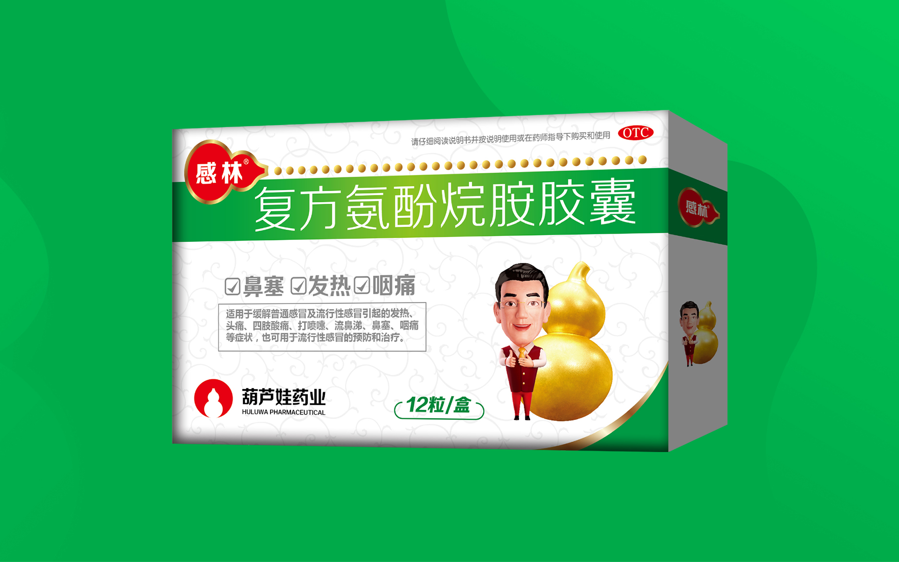 能增强对乙酰氨基酚的解热镇痛效果,并能减轻其他药物所致的嗜睡、头晕等中枢抑制作用;马来酸氯苯那敏为抗过敏药,能减轻流涕,鼻塞、打喷嚏等症状;人工牛黄具有解热、镇惊作用。上述诸药配伍制成复方,可增强解热、镇痛效果、解除或改善感冒所引起的各种症状。